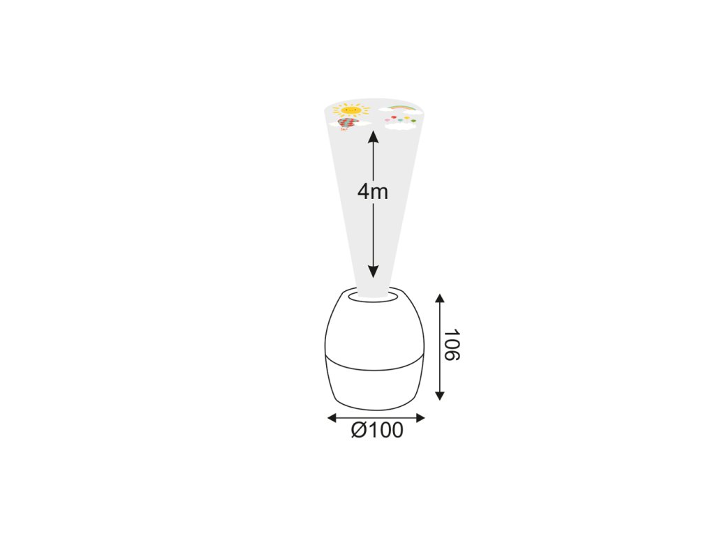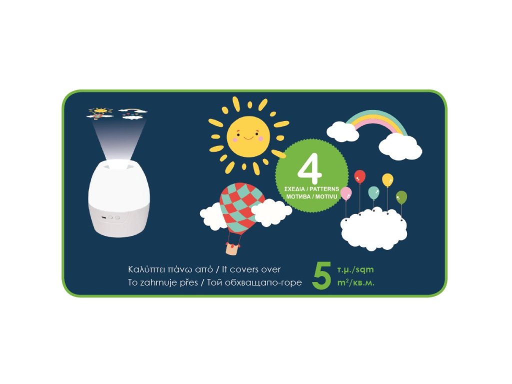 - Obsahuje stropní projektor, který promítá dětské obrázky na strop