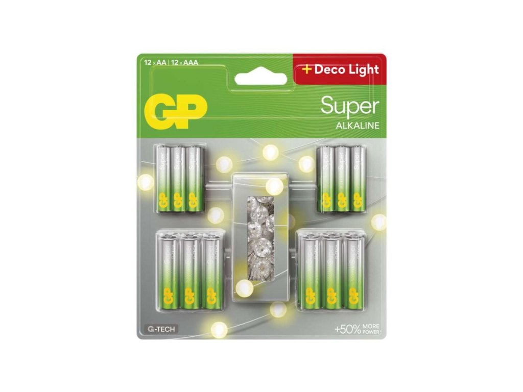 GP alkalická baterie SUPER AA 12 + AAA 12 + LED řetěz BL