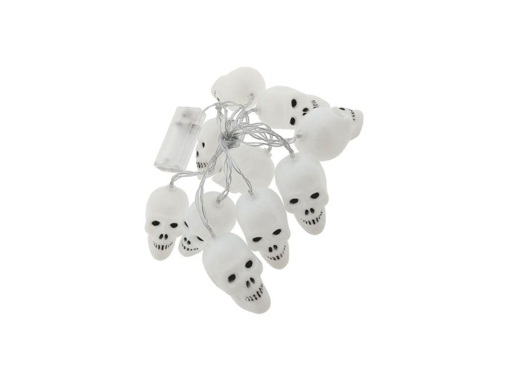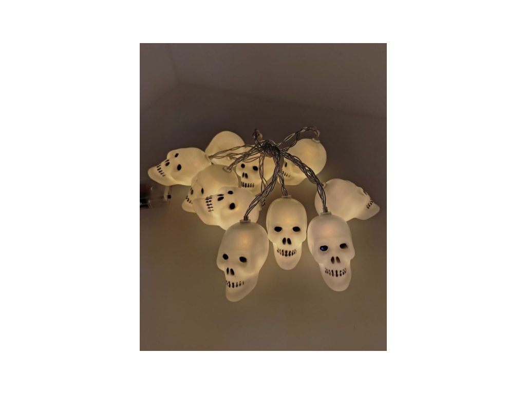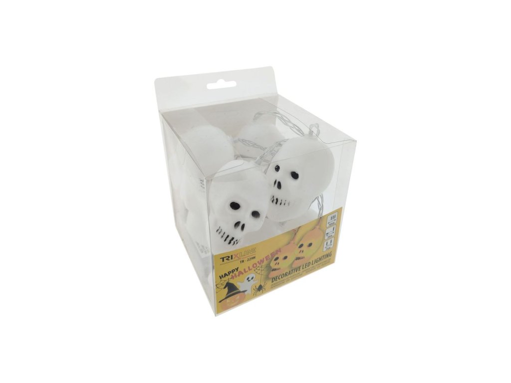 Haloweenské osvětlení - Lebky TRIXLINE TR-229HZdroj světla: LED<BR/>Počet LED: 10 ks<BR/>Barva světla: teplá bílá 2700K<BR/>Materiál: plast<BR/>Napájení: 2x AA 1,5V (nejsou součástí)<BR/>Rozteč žárovek: 15cm<BR/>Přívodní kabel: 30cm<BR/>Celková délka: 165cm<BR/>Funkce:ON/OFF<BR/>Rozměr světýlka - lebky: cca 65x45mm<BR/><BR/>Skvělá volba pro všechny, kdo chtějí doladit svou halloweenskou výzdobu do posledního detailu. Lebky se jemně rozzáří teplým bílým světlem a navodí tu pravou strašidelnou atmosféru.<BR/><BR/>Není určeno pro venkovní instalaci, používejte pouze v interiéru.