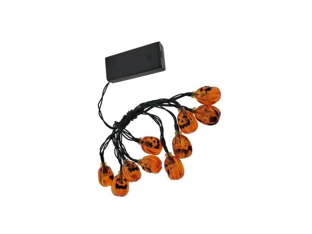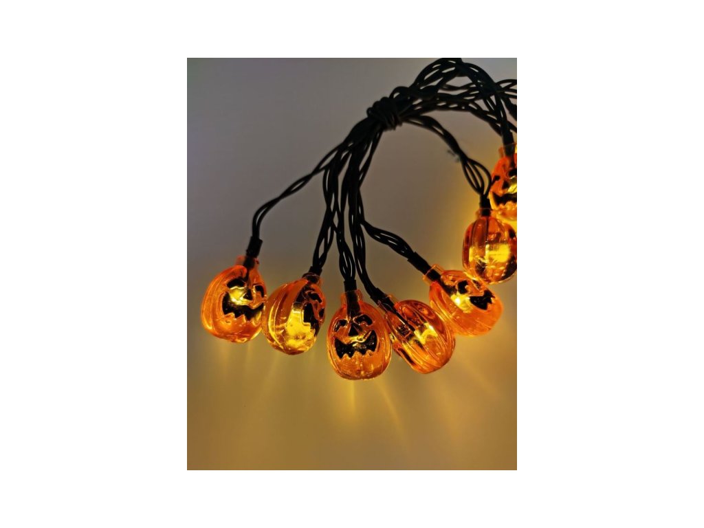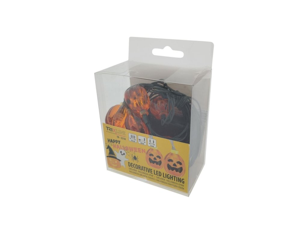 Haloweenské osvětlení - Malé dýně TRIXLINE TR-231HZdroj světla: LED<BR/>Počet LED: 10 ks<BR/>Barva světla: teplá bílá 2700K<BR/>Materiál: plast<BR/>Napájení: 2x AA 1,5V (nejsou součástí)<BR/>Rozteč žárovek: 15cm<BR/>Přívodní kabel: 30cm<BR/>Celková délka: 165cm<BR/>Funkce:ON/OFF<BR/>Rozměr světýlka - dýně: cca 22x30mm<BR/><BR/>Skvělá volba pro všechny, kdo chtějí doladit svou halloweenskou výzdobu do posledního detailu. Malé dýně se jemně rozzáří teplým bílým světlem a navodí tu pravou strašidelnou atmosféru.<BR/><BR/>Není určeno pro venkovní instalaci, používejte pouze v interiéru.