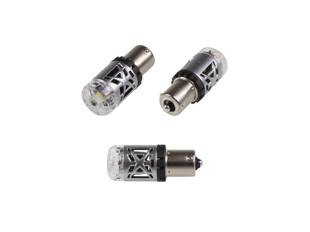 Nová generace LED autožárovek (high brightness) s aktivním chlazením a s paticí BAU15S, bílá. Nehlásí závady řídící jednotky na žárovce u nových vozidel se systémem kontroly praské žárovky, např.: u VW, Audi, Škoda, Seat, BMW, Volvo, Mercedes, Porsche a Mini. Vlastnosti: • vynikající do vozidel, kde dochází k častému praskání klasických žárovek • vysoká svítivost • svítí ve směru 360° bez tmavých bodů díky reflexní čočce • pro všechny osobní vozy, dodávky a motocykly s palubním napětím 12 V • vzhledem k vyššímu odběru proudu nehlásí chybu ve vozidlech s hlídáním žárovek chybu • bez polarity napájení, svítí při jakémkoliv zapojeníTechnické parametry: • patice: BAU15S • barva světla: bílá (6000 K) • bez polarity • světelný zdroj: 2x SMD LED 7035/3020 • světelný tok (skutečný): 1600 LM • světelný výkon: 23 W • úhel svícení: 360⁰ • vestavěná elektronika hlídá konstantní proud • odolné otřesům, častému zapínání a vypínání • aktivní chlazení pomocí vestavěného vysokorychlostního ventilátoru • napájecí napětí: 9 V