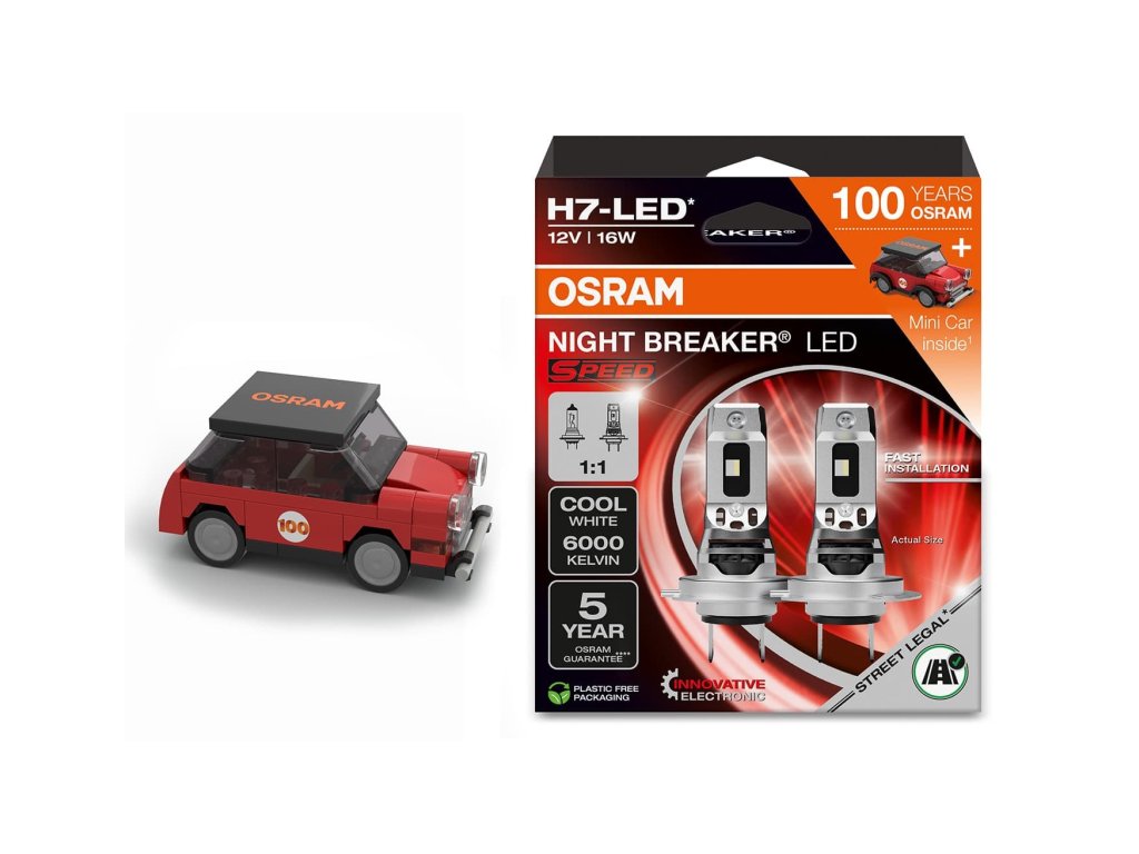 akční balení legálních LED žárovek H7 řady SPEED, které jsou připraveny ve speciálním jubilejním balení spolu s LEGO skládačkou mini autíčka OSRAM. Společnost OSRAM letos slaví výročí 100 let od vyvinutí první dvouvláknové halogenové žárovky s obchodním názvem BILUX. OSRAM Night Breaker LED SPEED H7 12V představuje špičkové LED řešení pro dálková i potkávací světla, které je plně legální pro provoz na veřejných komunikacích v České republice i dalších zemích EU. Nabízí výrazně vyšší jas, moderní design a zároveň snadnou instalaci díky technologii plug & play. Výkonná a legální LED náhrada halogenové žárovkyOSRAM Night Breaker LED SPEED H7 je jednou z mála LED náhrad halogenových žárovek, která je oficiálně schválena pro provoz na pozemních komunikacích v České republice i dalších zemích EU. Splňuje přísné normy ECE R112 a má udělené homologace od ministerstva dopravy, které zaručují její bezpečné a zákonné použití v dálkových i potkávacích světlometech u vybraných vozidel. Pro legální výměnu LED žárovek za halogenové autožárovky je nutné si prostudovat kroky před nákupem a po nákupu NB LED H7, (hlavně zjistit, zda je Váš vůz v seznamu schválených vozů) najdete zde Žárovka, které zapadne na první pokus