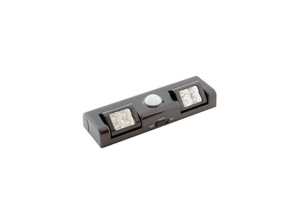 LED osvětlení s PIR čidlem do skříně černé8x LED, přepínač OFF-AUTO-ON, dosah PIR 3m, napájení 3xAA, rozměry: 160x50x25mmLED osvětlení se hodí všude tam, kde je nutné svítit, ale není možné přivést silový proud pro napájení standadního svítidla. LED světlo je napájeno třemi AA bateriemi. Oboustranné lepicí proužky umožňují připevnit světlo na kteroukoli plochu. Automaticky spíná díky integrovanému PIR senzoru. Materiál: Hliník + plast Barva světla: studená bílá Počet LED: 10 Napětí: DC 3-6V rozmezí 3-5 metrů Úhel: