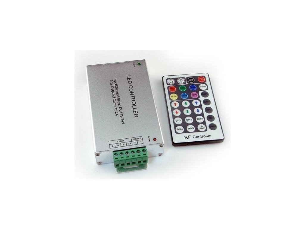 Programovatelný ovladač pro RGB LED pásky - RF (radiofrekvenční ovládání) umožňuje dálkově ovládat intensitu jasu, nastavení barev, barevných přechodů a jejich rychlost u RGB LED pásků a modulů. Přijímač může být ukrytý (za zdí, sádrokartónem či ve skříni), není nutná přímá viditelnost přijímače pro ovladač. Lze připojit až 20 m RGB LED pásku 30LED/1m nebo 10m 60LED/1m.Počet programů: 28 tlačítek, 7 přednastavených barev, 5 předvoleb pro nastavení vlastní barvy s možností nastavení automatického přepínání těchto nastavených barev, přepínání 3 nebo 7 barev, prolínání 3 nebo 7 barev, možnost nastavení rychlosti a intenzity jasu při statické barvě. Nastavení předvolby barvy: navolte krátkým stiskem předvolbu, nastavte barvu šipkami jednotlivých barev, přidržte déle opět předvolbu, barva je uložena v paměti.