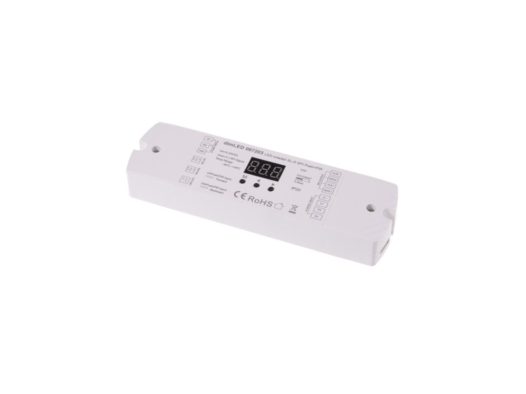 SPI ovladač s SPI výstupní signálem pro digitální LED pásky. Ovladačem dimLED SL-D SPI lze ovládat: Digitální jednobarevné LED pásky Digitální RGB LED pásky K ovladači je možné dokoupit toto příslušenství (není součastí balení): PIR senzor 5m Světelný senzor 5m Ovladač nabízí široké možnosti nastavení a efektů digitálních SPI LED pásků. Díky PIR senzorům můžete aktivovat nastavené světelné efekty při zaznamenání pohybu. K ovladači lze připojit až dva PIR senzory, což umožňuje snímat pohyb ve dvou částech místnosti. Toto řešení je ideální například pro schodiště nebo chodby. Směr světelného efektu lze nastavit tak, aby začal na straně, kde byl zaznamenán pohyb, a v případě pohybu na druhé straně začal tam. Světelný senzor umožňuje aktivaci PIR čidel pouze při dosažení určité úrovně osvětlení (LUX). Ovladač lze také ovládat externím tlačítkem nebo dvěma tlačítky, což umožňuje spínání efektů z různých částí místnosti stejně jako u PIR čidel. Ovladače je možnést tedy spínat pomoci: Připojením tlačítka Připojením PIR senzoru Světelným senzorem Digitální ovladačů umožňuje ovládání až 960 LED diod (pixelů). Ovladač podporuje tyto modelů čipů: TM1804, TM1809, TM1812, UCS1903, UCS1909, UCS1912, UCS2903,UCS2909, UCS2912, WS2811, WS2812, TM1829, TM1914A, GW6205,GS8206,GS8208,LPD6803, LPD1101, D705, UCS6909, UCS6912, LPD8803,LPD8806, WS2801, WS2803, P9813, SK9822, SM16703P. Specifikace LED ovladače Vstupní napětí 5-24V DC Vstupní proud 15A Výstupní signál 2x SPI (TTL) Připojení Vstup/výstup - mechanické svorky Max. počet ovládaných diod (pixelů) 960 Rozměry 170*50*23mm Typ stmívání SPI signál Paměť posledního nastavení po odpojení napájení: Ano Stupeň krytí: IP20 Maximální délky kabelů senzorů: Senzor světla je dodávaný v délce 5m, lze prodloužit až na 10m. Prodlužovací kabel k PIR čidlům je dodávaný v délce 5m, lze prodloužit až na 15m . Možnosti spínání SL32: Přes dodaná 2 PIR čidla. Přes tlačítka paralelně zapojená Možnosti připojení LED pásků (jednotlivé zapojení naleznete v návodu): Využití až 32 DC výstupů a DC LED pásků nejčastěji pro osvětlení jednotlivých schodů (případně 64 u dvou SL32). Zapojení digitálního LED pásku jako linie. Například pro osvětlení zábradlí, orientačního osvětlení vedle schodů v linii. Zapojení digitálního LED pásku jako ve tvaru Z na jednotlivé schodnice. Světlo se bude rozsvěcet jako "had" postupně. Kombinace DC výstupů (LED pásků) a digitálního. Osvětlení jednotlivých schodů dohromady například s osvětlení zábradlí apod.Buďte první, kdo napíše příspěvek k této položce.