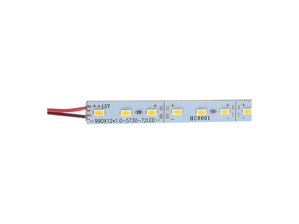 LED pásek 12mm hliníkový, 6500K, 72x LED5730/m, IP20, délka 1mLED pásek 12mm na částečně ohebné hliníkové podložce, lépe odvádějící teplo. Délka 1m se samostatným přívodem. Moduly je možno dělit i spojovat, stejně jako standardní flexibilní pásky. Dodáváno v délkách 1m se samostatným přívodem. <BR/><BR/>**Specifikace:** <BR/>Napájecí napětí: 12VDC <BR/>72xLED SMD5730, barva studená bílá 6500K <BR/>Příkon: 14,4W <BR/>Světelný tok: 1200lm <BR/>Krytí IP20<BR/>Rozměry: 12mm x 1m, tloušťka Al podložky: 1mm <BR/>