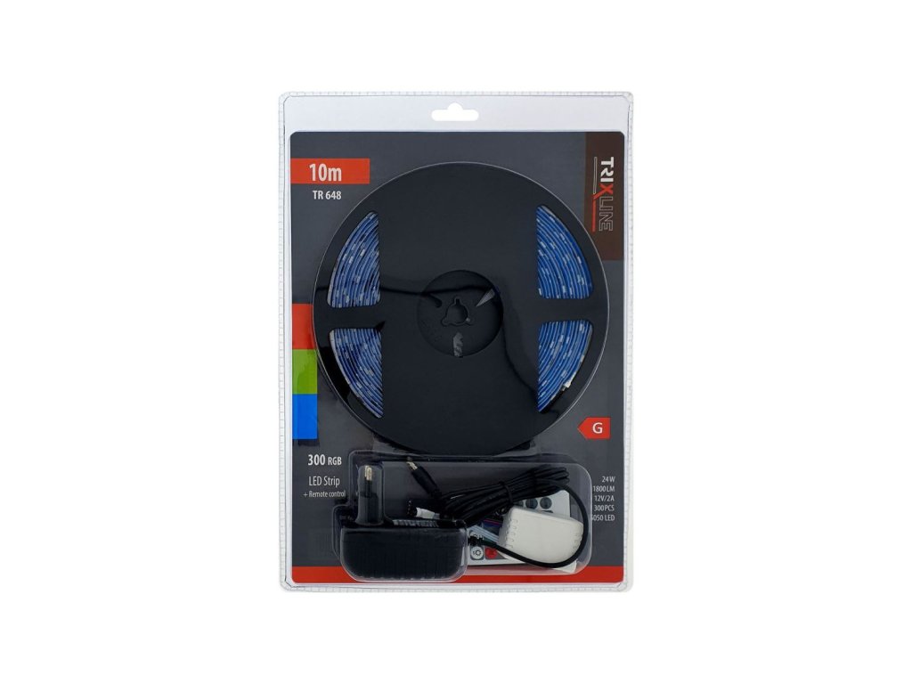 Led pásek 24W RGB 10m s dálkovým ovladačem TRIXLINE TR 648Zdroj světla: LED<BR/>Počet LED: 300<BR/>Barva světla: RGB (multicolor)<BR/>Délka: 10m<BR/>Vstupní napětí: AC 230V / DC 12V<BR/>Příkon: 24W<BR/>Úhel svitu: 120°<BR/>LED čip: 5050<BR/>Světelný tok: 1800lm/m<BR/>Životnost: až 50000 hodin<BR/>Krytí: IP20<BR/><BR/>Dálkové ovládání:<BR/><BR/>Pásek lze intuitivně ovládat pomocí dálkového ovladače. Můžete si navolit 16 barevných odstínů, regulovat jas, blikání barev (flash), režim blednutí světla (strobe), režim blednutí barev (fade) a plynulý režim (smooth).<BR/><BR/>Obsah balení:<BR/><BR/>RGB LED pásek TR 648 10m<BR/>Dálkový ovladač včetně 1x CR2025 baterie<BR/>Adapter<BR/>Přijímač<BR/>Návod k použití<BR/>Balení: 1/20<BR/><BR/>Rozměr balení 1ks (ŠxVxH): 250x355x55mm<BR/>Váha balení 1ks: 520g