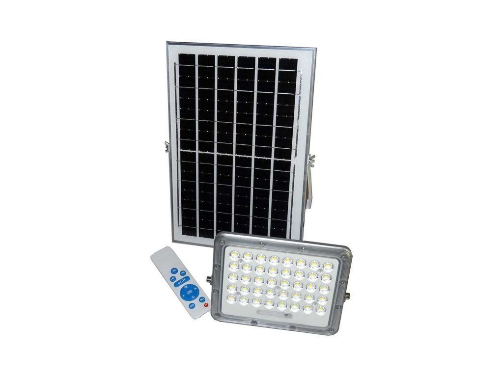 LED reflektor 5W se solárním panelem /Solární světlo/LED reflektor včetně dálkového ovládání napájený články LiFePO4 a dobíjením ze solárního panelu. Bez pohybového čidla, avšak s časovým spínačem a automatikou pro blokování funkce okolním světlem. <BR/>**Funkce** <BR/>1) AUTO: V tomto režimu se světlo automaticky rozsvítí, pokud na solární panel nedopadá denní světlo, tzn. když panel negeneruje žádnou energii. Intenzitu osvětlení lze regulovat. Poslednínastavení zůstane uloženo v paměti. Světlo bude svítit po celou dobu, kdy nebude panel osvícen denním světlem. <BR/>2) 3H, 5H, 8H - stejná funkce jako v režimu AUTO, avšak s časovým omezením 3h,4h nebo5 hodin. <BR/>3) ON, OFF - zapnutí nebo vynutí bez ohledu na intenzitu okolního osvětlení. <BR/>4) Možnost nastavení plného nebo polovičního jasu (tlačítko se sluníčkem) a kontinuální regulace intenzity osvětlení (tlačítka W a Y). <BR/>5) Nabíjecí a vybíjecí indikace pomocí LED bargrafu s 5x LED. Při nabíjení sloupec postupně rozsvěcuje, při rosvíceném světle trvale svítí. Pokud je reflektor vypnutý nebo je v režimu AUTO, LED bargraf nesvítí. <BR/><BR/>**Reflektor LED:** <BR/>Počet LED: 40LED SMD 5050<BR/>Příkon reflektoru: 5W <BR/>Světelný tok: 450lm<BR/>Barva světla: studená bílá <BR/>Napájení: 8x integrovaný článek LiFePO4 18500 3,2V 8x1Ah <BR/>Integrovaná nabíječka <BR/>LED bargraf s indikací stavu nabití a vybití<BR/>Včetně přijímače dálkového ovládání <BR/>Rozměry: 190x150x50mm <BR/>Krytí IP67 <BR/>**Solární panel:** <BR/>Nominálnívýkon 10W<BR/>Nominální napětí: 6V <BR/>Max.napětí Voc: 7,2V <BR/>Max. proud: 1,99A <BR/>Rozměry: 350x235x15mm <BR/>Přívodní kabel 4,5m <BR/>Provozní teplota: -20°C až +40°C <BR/>**Obsah balení:** <BR/>- reflektor LED <BR/>- solární panel 10W<BR/>- dálkové ovládání - včetně baterií (2xAAA) <BR/>- montážní materiál (šroubky, konzole)