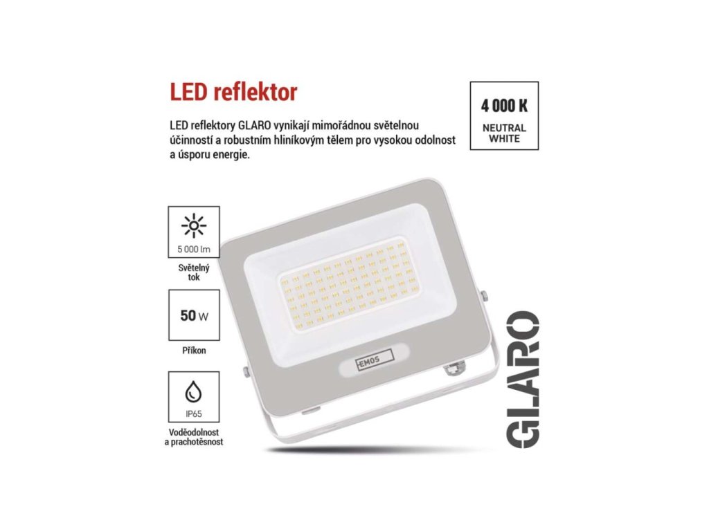 LED reflektor GLARO 50W, bílý, IP65, 5000 lm, neutrální bílá