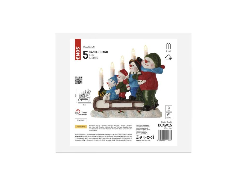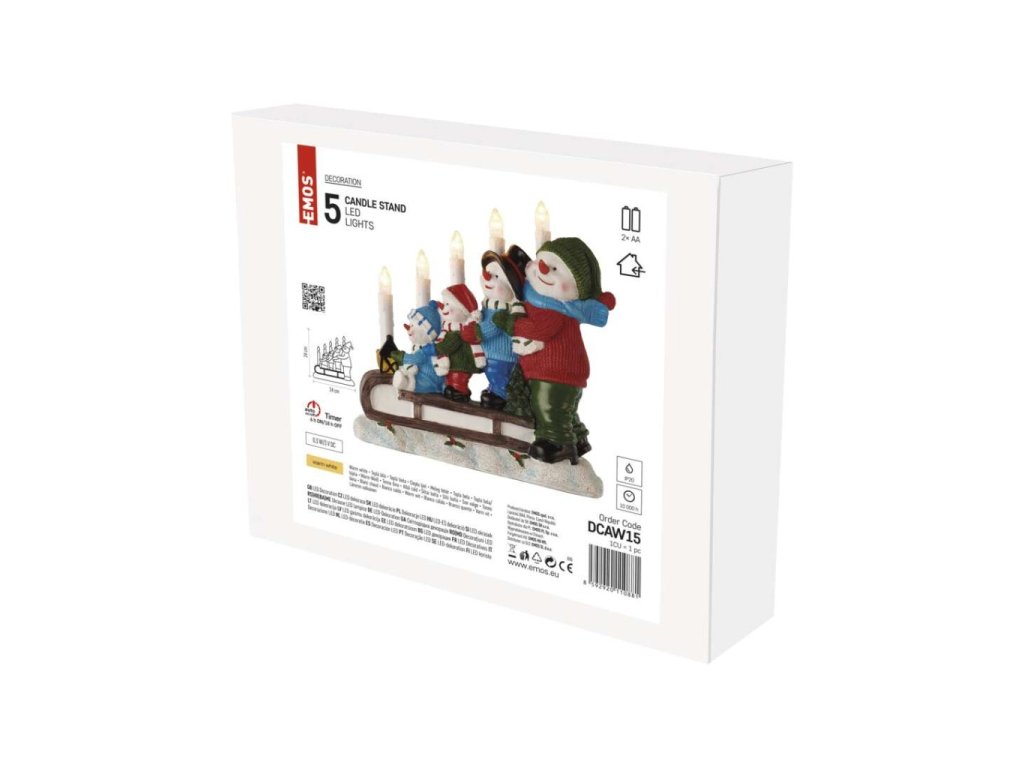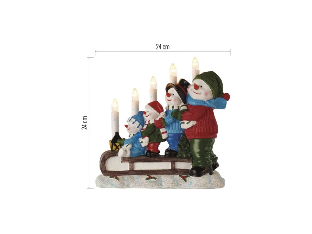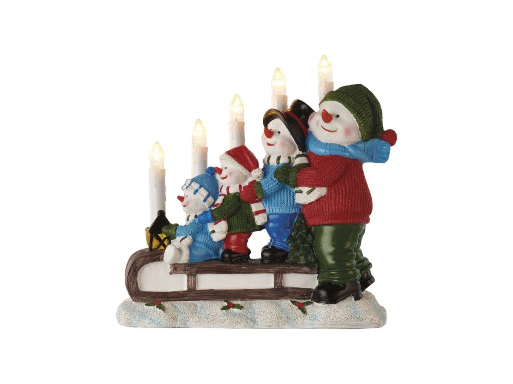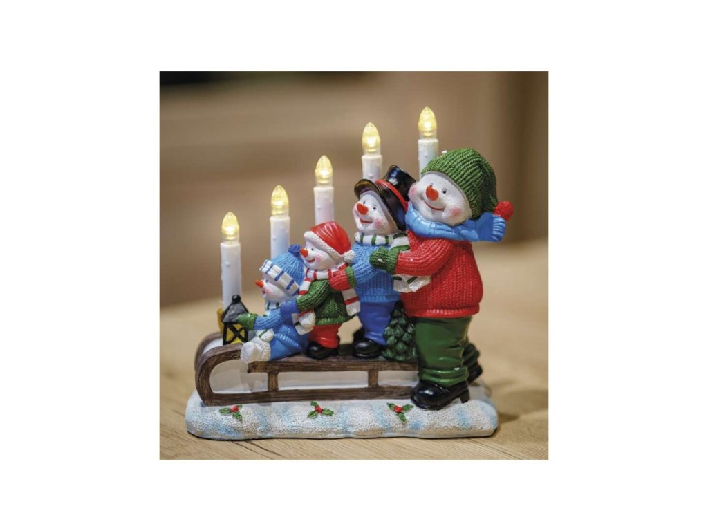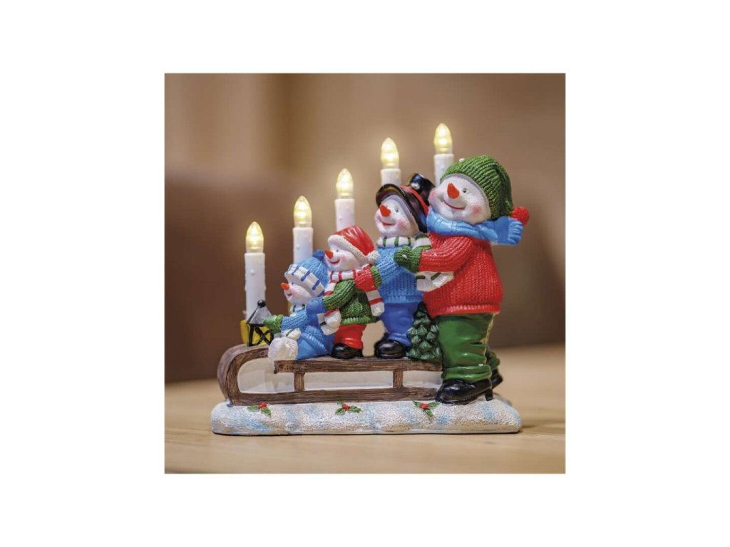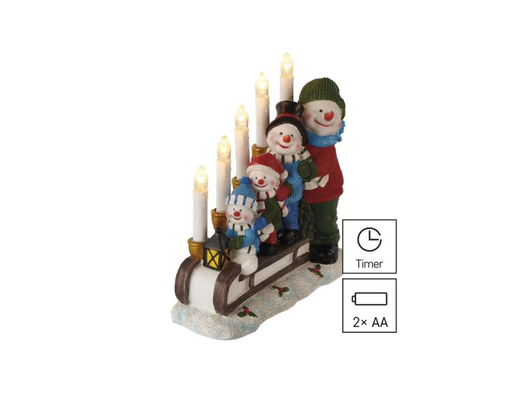 LED svícen – sněhuláci na saních, 24 cm, 2x AA, vnitřní, teplá bílá, časovač
