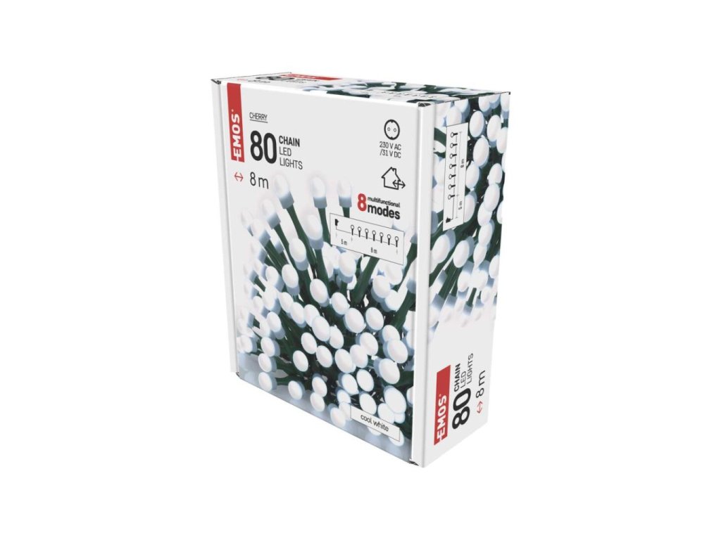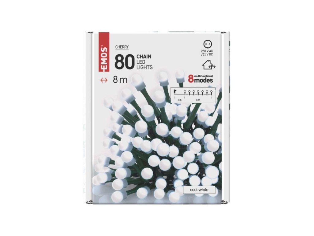 LED vánoční cherry řetěz – kuličky, 8 m, venkovní i vnitřní, studená bílá, programy