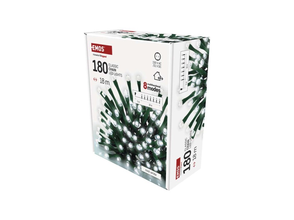 LED vánoční řetěz, 18 m, venkovní i vnitřní, studená bílá, programy, časovač