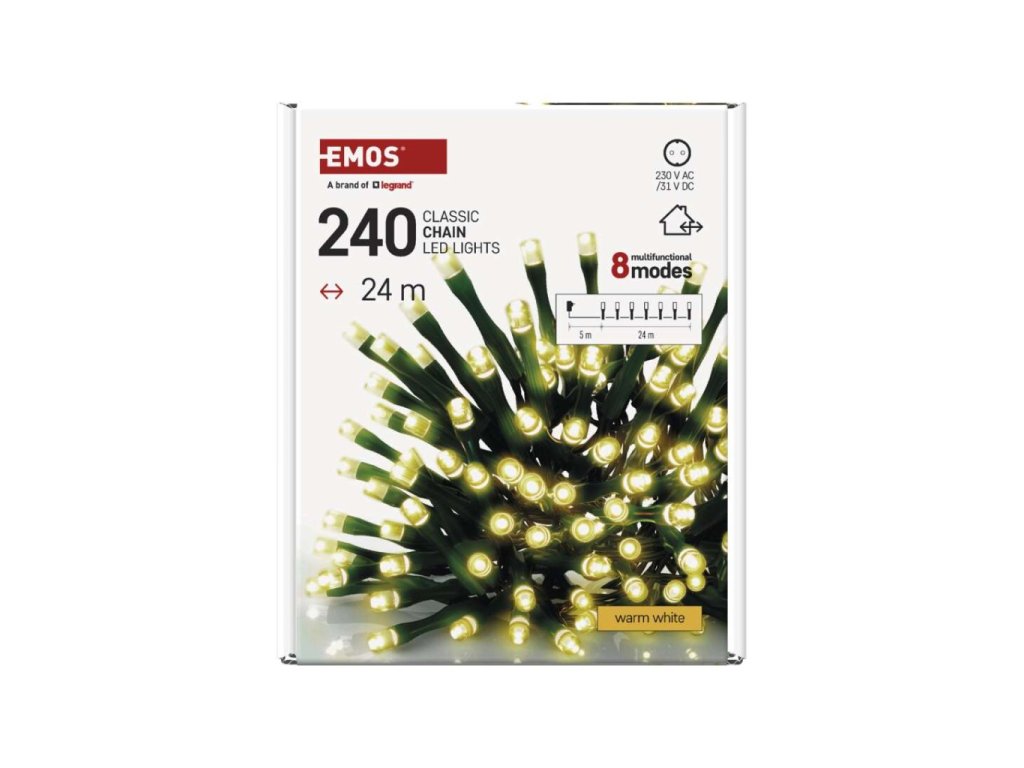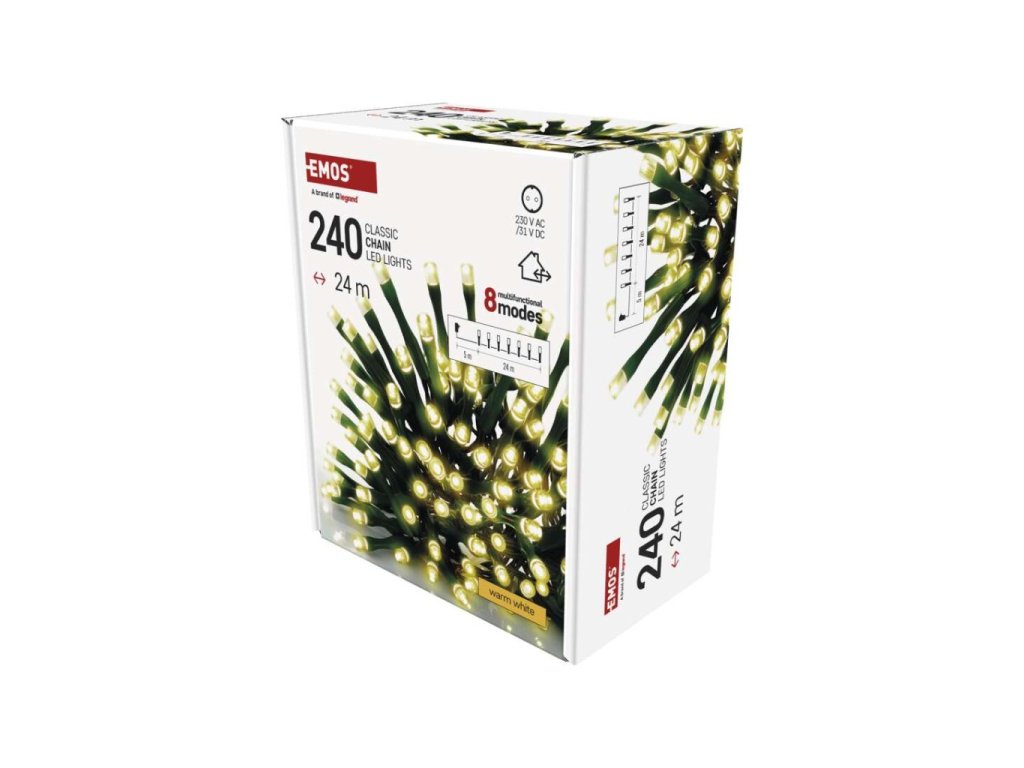 LED vánoční řetěz, 24 m, venkovní i vnitřní, teplá bílá, programy, časovač