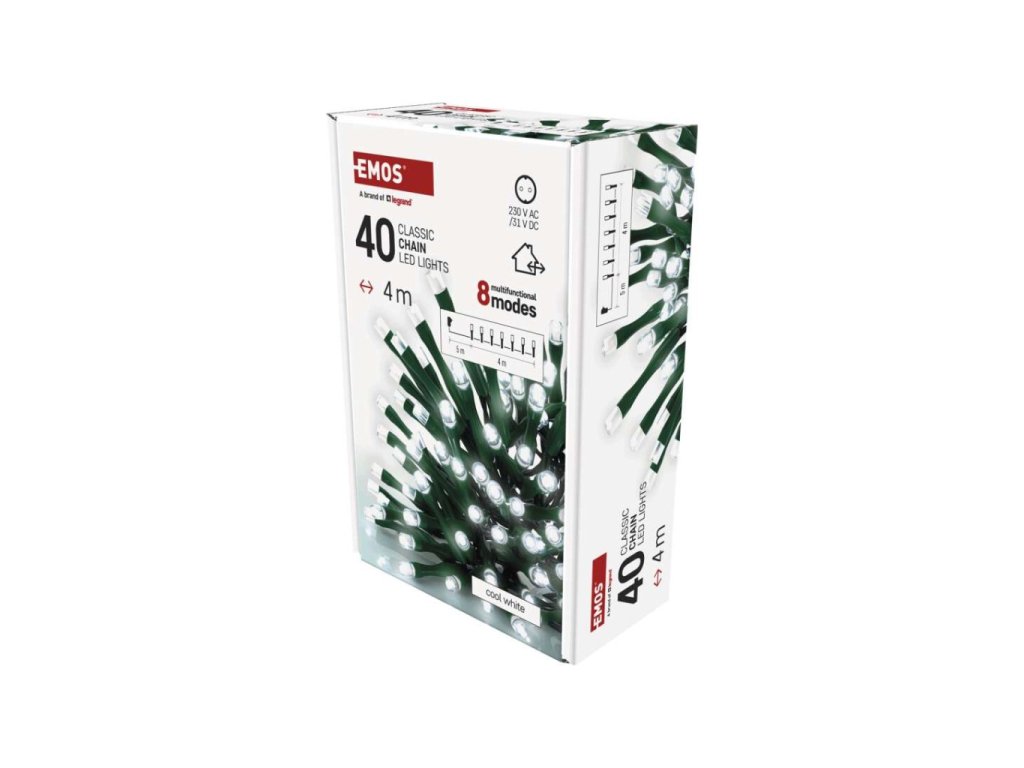 LED vánoční řetěz, 4 m, venkovní i vnitřní, studená bílá, programy, časovač