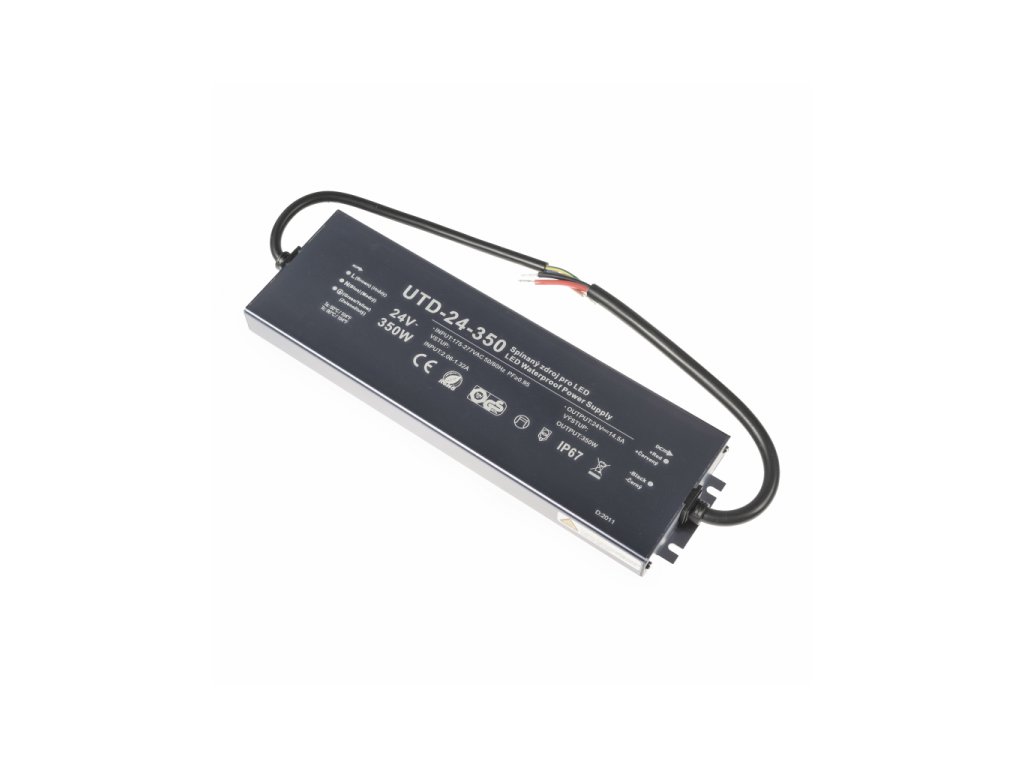 Model zdroje UTD-24-350 nelze použít se stmívači, vhodný pro instalace bez stmívání! LED zdroj pro LED pásky UTD-24-350 je opatřen: tepelnou pojistkou pojistkou proti zkratu (po odstranění zkratu je opět plně funkční) pojistkou proti přetížení Voděodolný elektronický spínaný zdroj s ochranou IP67 a 5letou zárukou. Specifikace LED zdroje Vstupní napětí 100-277VAC Výstupní napětí 24V DC/14,5A Účinnost 93% Výkon 150W* Krytí IP67 Rozměry 282×86×23,5mm Záruka 5 let * !!! Upozornění !!! max. trvalé doporučené zatížení je s min. 10% rezervou pro běžné užívání, pro instalaci do komerčních prostor s dobou používání 8 a více hodin denně nepřetržitě je doporučené trvalé zatížení vzhledem k účinnosti spínaných zdrojů s min. 20% rezervou , aby byla zachována nejdelší životnost zdroje.Doplňkové parametry