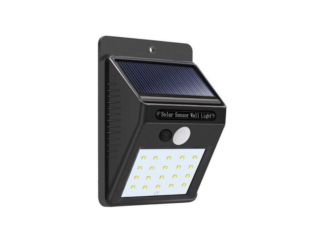 Solární svítidlo LED-20x s PIR čidlem nástěnné /Solární světlo/Praktické LED nástěnné svítidlo s PIR čidlem, solárním nabíjecím panelem a Li-Ion článkem 18650 3,7V/1200mAh. Článek je umístěn v držáku a dá se snadno vyměnit. Ideální pro umístění do venkovních prostor, které mají být osvětleny pro bezpečný průchod.