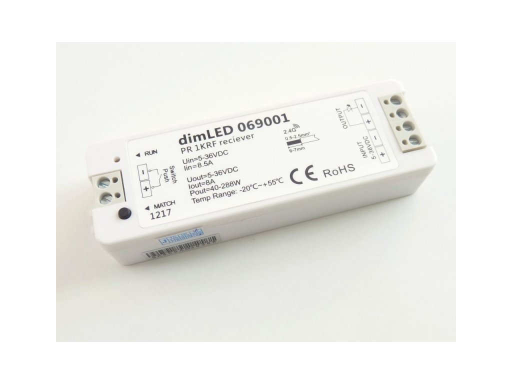 Radiofrekvenční přijímač stmívač pro LED produkty. Přijímač může být ukrytý (za zdí, sádrokartónem či ve skříni), není nutná přímá viditelnost přijímače pro ovladač.Přijímač je kompatibilní se všemi ovladači řady dimLED !!!