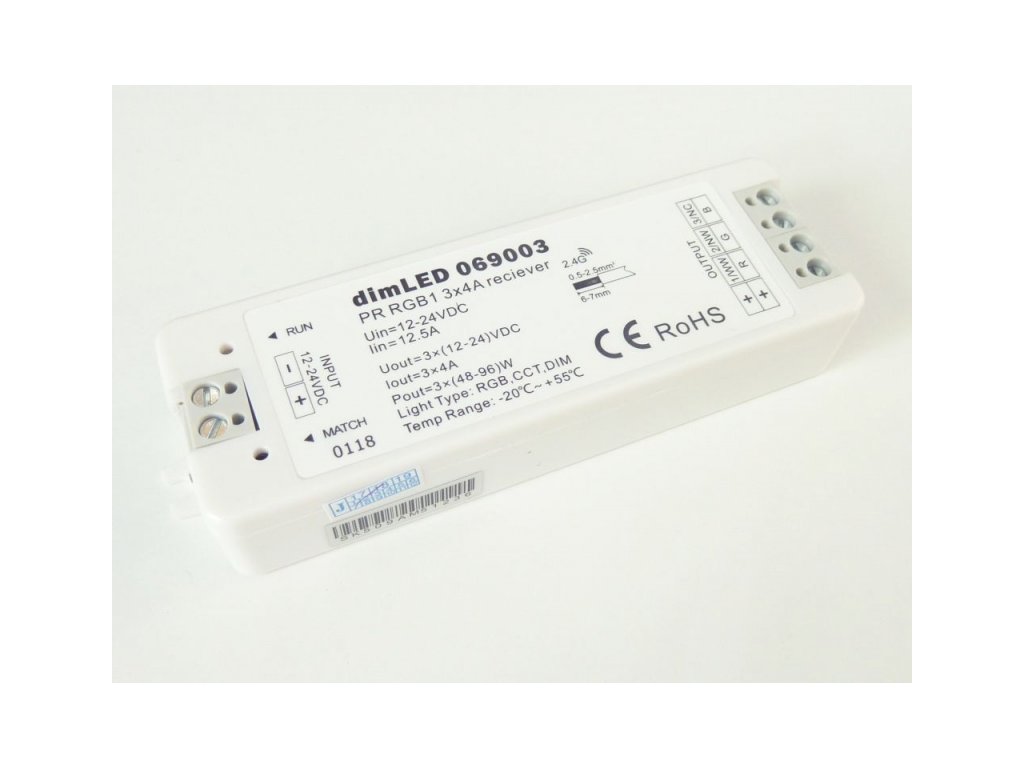 Radiofrekvenční přijímač stmívač pro RGB LED produkty. Přijímač může být ukrytý (za zdí, sádrokartónem či ve skříni), není nutná přímá viditelnost přijímače pro ovladač. Přijímač je kompatibilní s RGB ovladači řady dimLED !!! Pro ovládání více okruhů je nutno použít jeden přijímač na každý okruh. Na každý přijímač lze napárovat až 10 různých ovladačů řady dimLED a tak ovládat z několika míst. V případě přerušení a poté opětovného připojení napájení (například přerušením napájení zdroje) má tento přijímač paměť nastavení intenzity (intenzita osvětlení se vrátí na naposled nastavenou). Specifikace přijímače:Vstupní napětí 12-24VDC