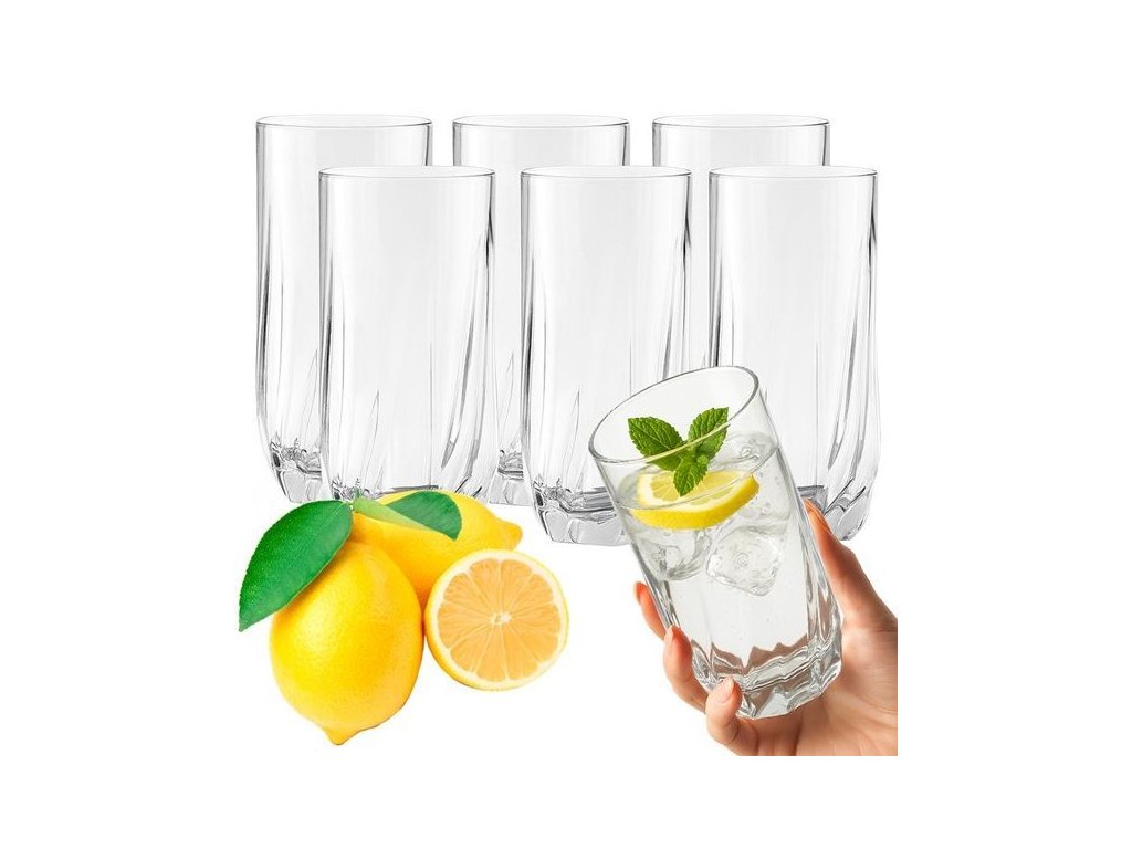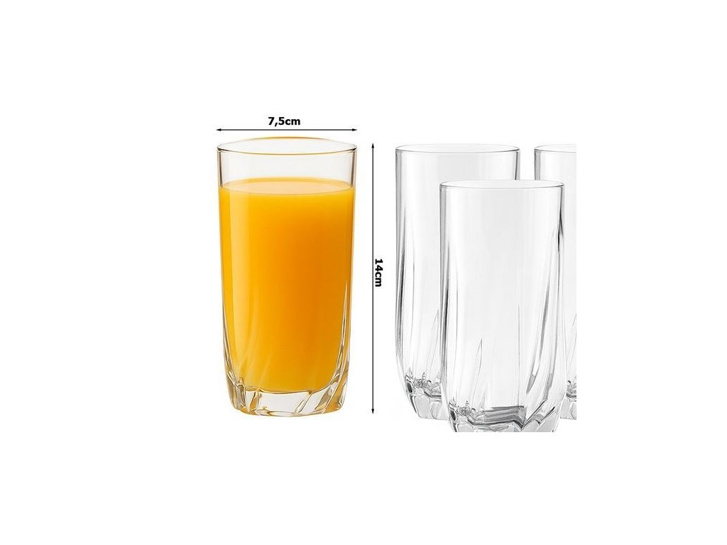 Sada sklenic 6ks, 340mlVLASTNOSTI PRODUKTU<BR/>- Skleněné provedení zajišťuje odolnost a odolnost proti poškození, takže si je můžete užívat každý den bez obav z prasknutí.<BR/><BR/>- Vysoké stěny sklenic jim dodávají eleganci a umožňují pohodlné podávání velkých porcí nápojů, což se skvěle hodí pro koktejly a vodu s přísadami.<BR/><BR/>- Objem 340 ml je ideální pro každodenní použití a umožňuje pohodlné nalévání klasických džusů i osvěžujících nápojů.<BR/><BR/>- Univerzální použití pro nápoje a drinky činí tuto sadu ideální pro večírky, večeře nebo relaxaci s knihou.<BR/><BR/>- Jemně zdobené sklo dodává charakter a jemnou eleganci, což z nich dělá efektní součást každého servisu.<BR/><BR/>- Určení pro studené nápoje zaručuje, že sklenice perfektně zvládnou led, citron nebo mátu, přičemž si zachovají průzračnost a svěží vzhled.<BR/><BR/> TECHNICKÁ SPECIFIKACE:<BR/>Materiál: sklo<BR/>Počet v sadě: 6 kusů<BR/>Barva: čirá<BR/>Objem: 340 ml<BR/>Určení: na studené nápoje, na drinky, na nápoje<BR/>Styl: zdobené, vysoké, skleněné <BR/><BR/>ROZMĚRY:<BR/>Výška: 14 cm<BR/>Průměr:7,5 cm