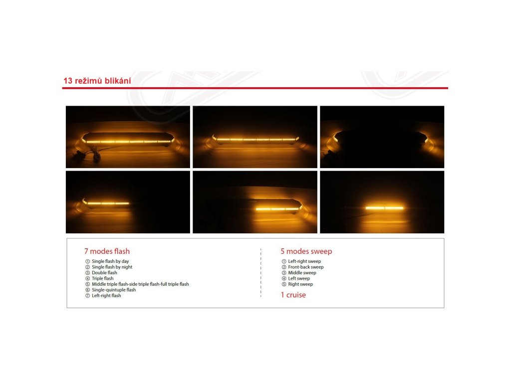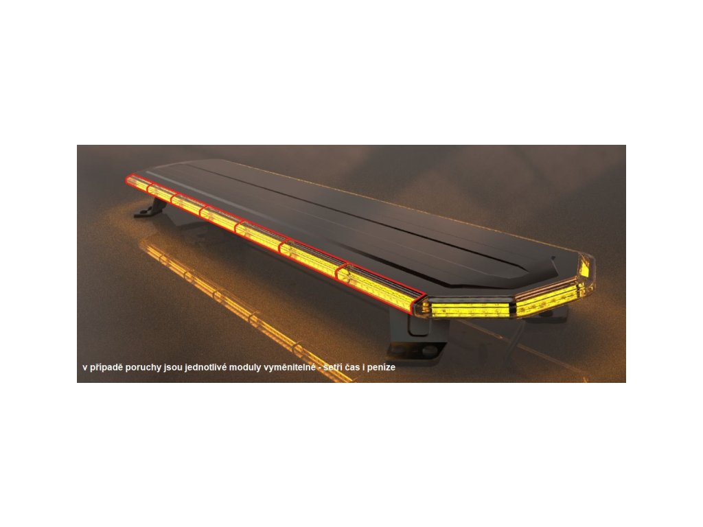 Tenká (2,5 cm) oranžová LED světelná rampa vhodná pro všechny typy vozidel. Je určená pro vozidla u kterých je kladen zvláštní důraz na výstražný efekt. Vzhledem ke své malé výšce je vhodná především pro moderní aerodynamické automobily, kde nezpůsobuje nadměrný hluk a zvýšenou spotřebu paliva.Technické parametry: • napájecí napětí 12-24 V • výkon 98 W • světelný zdroj: 36+144LED • 14 variant režimů výstražného problikávání • homologace ECE R65, R10 • rozměry: délka 1070 mm • vodotěsná IP67 • pracovní teplota -40 ºC