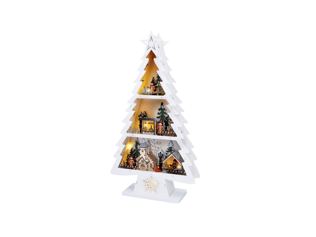 LED dřevěný vánoční stromek s dekoracemi, 13x LED, bílá, 53cm, 2x AA