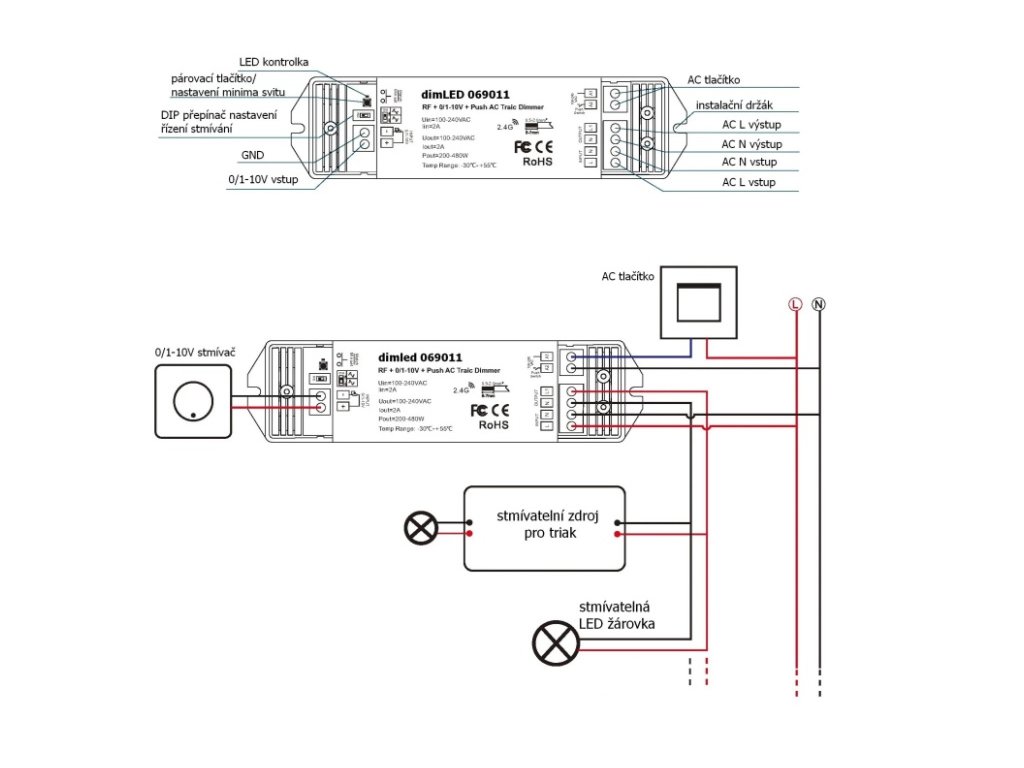 Stmívač a přijímač pro stmívatelné LED žárovky a panely na 230V s možností použití ovládání pomocí ovladačů 0/1-10V. Lze také ovládat i různými druhy dálkových ovladačů řady dimLED z naší nabídky, kterými můžete zároveň ovládat i systémy na 12 či 24V jako LED pásky apod. Vše tedy poté můžete řídit jedním ovladačem a nemusíte mít poté například na LED pásky a žárovky 2 různé ovladače. Díky těmto možnostem patří mezi špičku na našem trhu.Stmívač je elektronický pro stmívání 0-100%, nicméně některé stmívatelné světelné zdroje většinou nejsou konstruovány pro plné stmívání 0-100%. Při nastavení stmívače na 0% či jinou nízkou hodnotu se může stát, že některá svítidla nefungují správně (například po vypnutí stmívače opětovném zapnutí nedojde k vybuzení zdroje a je nutné na stmívači přidat hodnotu jasu pro rozsvícení). Řešení je najít na světle polohu, kam na minimum stmívat před vypnutím.