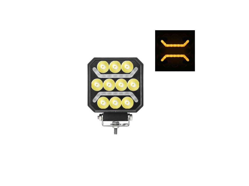 Čtvercové pracovní světlo má funkce: pracovní světlo bodové bílé, poziční světlo oranžové.