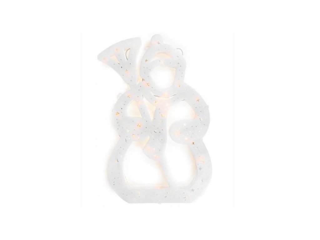 LED dekorace sněhuláka, 3xAA , 42cm, teplá bíláTechnické parametry:<BR/>Rozměry: 42 x 24 cm<BR/>Napájení z baterií: 3x AA (nejsou součástí balení)<BR/>Barva světla: teplá bílá<BR/>Dekorace z bílého plastu<BR/>Pro vnitřní/vnější použití<BR/>Jasné živé barvy<BR/>Blikající efekt<BR/>Nevydávají teplo<BR/>Vypálení diody nevypne přístroj.<BR/>Dekorace mají úchyt pro zavěšení<BR/>Úspora energie