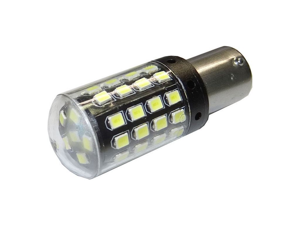 Žárovka LED Ba15S 12V bílá, 54x SMD3030 do blinkrůLED žárovka s paticí Ba15S určená pro občasný přerušovaný provoz v blikrech automobilů. Má odběr podobný obyčejné žárovce, takže v palubní síti nebude vykazovat chybové hlášky a frekvence blikání budestejná, jako při použití obyčejných žárovek. <BR/>**Specifikace:** <BR/>Palubní napětí: 12V <BR/>Napájecí napětí: 11-14,5V <BR/>Reálně naměřený příkon: 21W/13V <BR/>Světelný tok: 1000lm <BR/>Barva: bílá<BR/>Rozměry: průměr žárovky: 20mm, délka žárovky: 57mm <BR/><BR/>**Upozornění:** <BR/>žárovka je určená pouze pro občasný přerušovaný provoz v blinkrech automobilů. Při nepřetržitém provozu se silně zahřívá a dojde k jejímu poškození. <BR/><BR/>Výrobek není homologován pro provoz na pozemních komuníkacích.